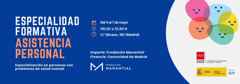 Fundación Manantial pone en marcha una nueva especialidad formativa en asistencia personal especializada en personas con problemas de salud mental, una formación gratuita dirigida tanto a personas desempleadas como a trabajadores y trabajadoras de cualquier sector de la Comunidad de Madrid. El objetivo de esta formación es capacitar a profesionales para acompañar y apoyar a personas con problemas de salud